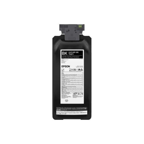 Cartucho de tinta Negra brillante Epson para la impresora de etiquetas ColorWorks C8000e SJIC48P-BK (480ml). La tinta pigmentada SJIC48P-BK para color negro brillante está diseñada para producir impresiones de alta calidad y alta definición en etiquetas InkJet a color